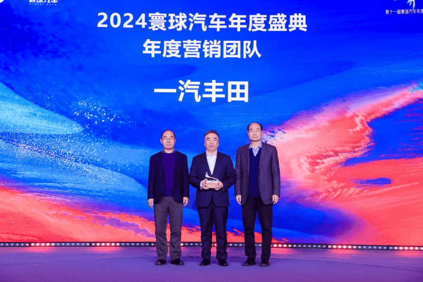 全球年度车评卫、国家书息核心本副主任、国家书息核心正高级经济师徐长明(右),全球年度车评卫、中国电动汽车百人会副秘书长师建华(左)为一汽丰田汽车销售有限公司党卫布告、总经理董修惠颁布第十一届全球汽车年度盛典年度营销团队奖